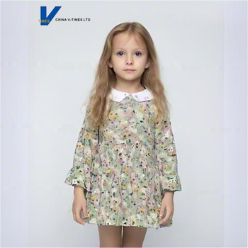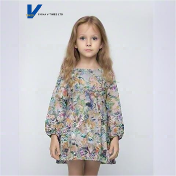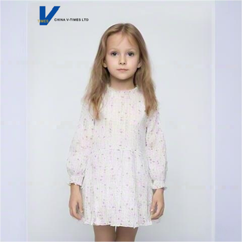 Caprichoso campo-Temática Base ligera Pequeño estampado floral Falda plisada Diseño de dobladillo Vestido de manga larga de primavera-otoño para niñas