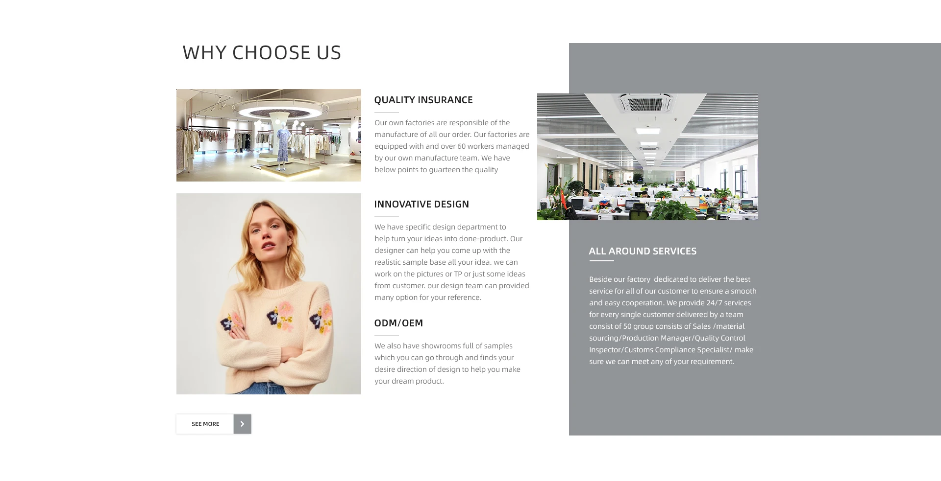 Integrated fabric sourcing, production, and logistics for fast order turnaround.Strict QC, international certifications (e.g., BSCI, OEKO-TEX), and skilled craftsmanship.Supports small MOQs, quick turnaround, and OEM/ODM customization.Meets ESG standards
